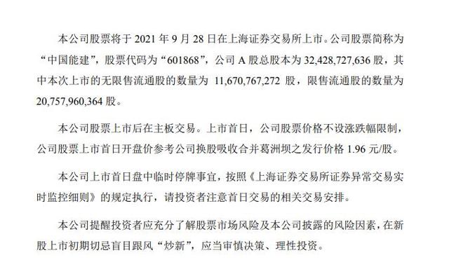 金融界网9月26日消息 中国能建公告,公司股票将于2021年9月28日在上海证券交易所上市。公司股票简称为“中国能建”,股票代码为“601868”。上市首日,公司股票价格不设涨跌幅限制,公司股票上市首日开盘价参考公司换股吸收合并葛洲坝之发行价格1.96元/股。