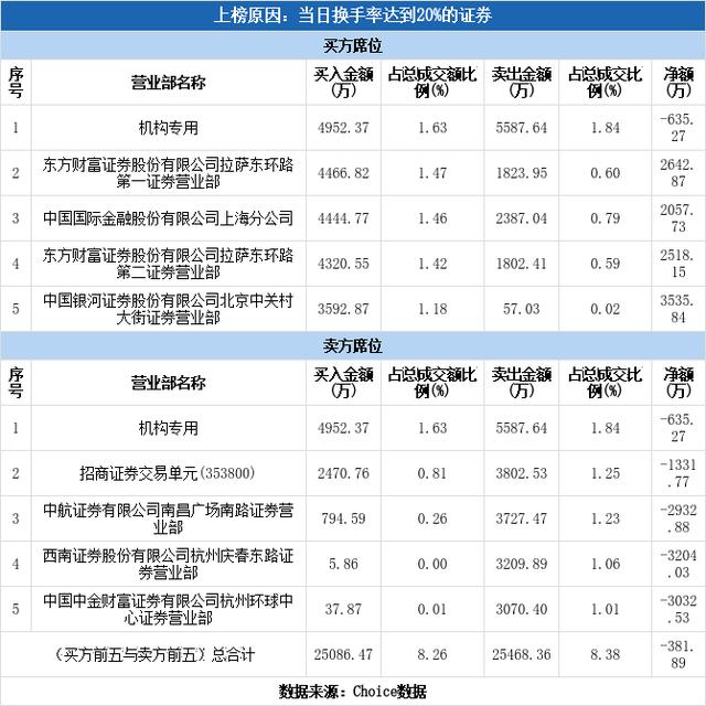 买二为东方财富证券拉萨东环路第一证券营业部,该席位买入4466.82万元,卖出1823.95万元,净买额为2642.87万元。近三个月内该席位共上榜1086次,实力排名第6。东方财富证券拉萨东环路第一证券营业部今日还参与了陕西金叶(净买额2916.95万元),湖北广电(净买额2226.38万元),罗曼股份(净买额1561.79万元)等12只个股。