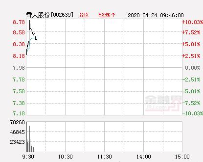 金融界网站4月24日讯 今日雪人股份开盘报8.19元,截止09:40分,该股涨10.03%报8.78元,封上涨停板。