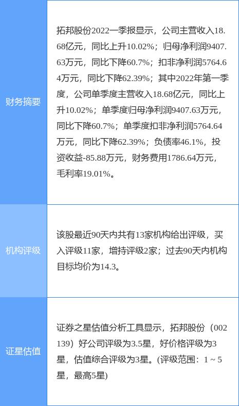 本文摘要:今日拓邦股份(002139)涨7.47%,收盘报8.49元。2022年4月22日,天风证券研究员唐海清,姜佳汛,潘暕发布了对拓邦股份的研报《重点业务快速增长,期待疫情和供应链影响解除》,该研报对拓邦股份给出“买入”评级。证券之星数据中心根据… …