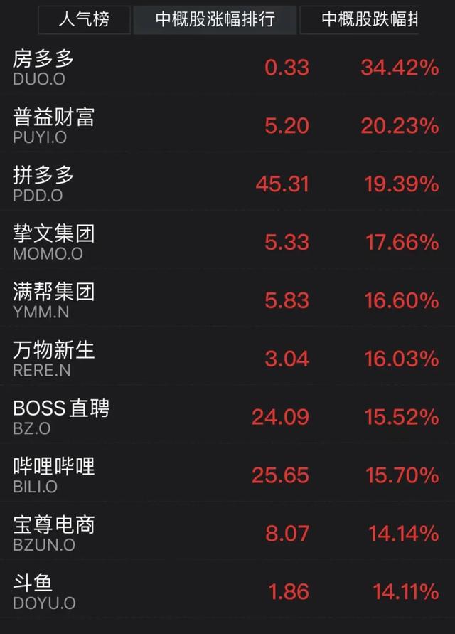 中概股则逆市大幅上涨。纳斯达克中国金龙指数最高涨幅超过10%。截至发稿,拼多多上涨超19%,哔哩哔哩上涨15%,阿里巴巴上涨11%,爱奇艺上涨12%,新东方、老虎证券等涨幅超过10%。