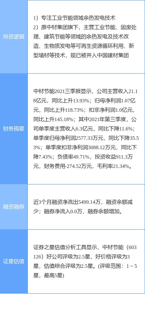 中材节能涨停收盘,收盘价7.46元。该股于9点35分涨停,未打开涨停,截止收盘封单资金为6086.99万元,占其流通市值1.34%。