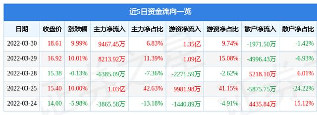 资金流向数据方面,当日主力资金净流入9467.45万元,游资资金净流入1.35亿元,散户资金净流出1971.5万元。近5日资金流向一览见下表: