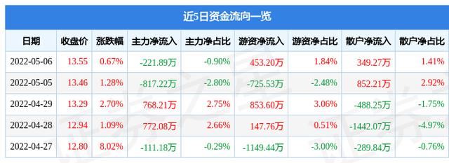 资金流向数据方面,5月6日主力资金净流出221.89万元,游资资金净流入453.2万元,散户资金净流入349.27万元。