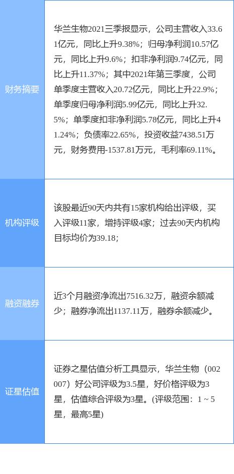 本文摘要:今日华兰生物(002007)跌5.63%,收盘报28.15元。2021年11月1日,太平洋研究员盛丽华发布了对华兰生物的研报《Q3单季度业绩同比快速增长,全年血制品业务有望实现稳定增长》,该研报对华兰生物给出“买入”评级,认为其目标价为37… …