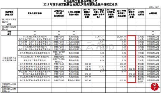 华兰生物2017年初关联方资金占用1853万,期间发生2.12亿,期末占用减少为911万。