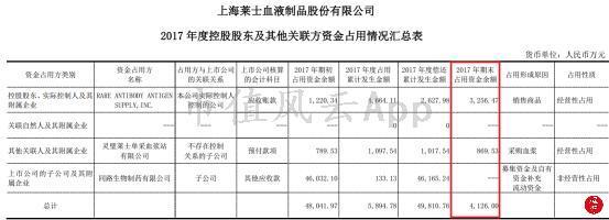 上海莱士2017年初关联方资金占用4.8亿(额度很庞大),期间发生5891万,期末占用减少为4126万。上海莱士前几年关联方资金占用额度也很大。