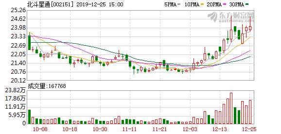 2019年12月25日,北斗星通A股开盘23.79元,全日小涨0.29%,股价收报24.08元。自2019年12月23日以来,北斗星通收盘价连续三日收于年线(250日均线)之上。