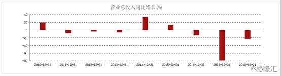 经格隆汇app查询显示,具体来看公司停牌期间的业绩情况,犹如坐过山车般急速下滑。2016年至2018年公司分别实现营收30.88亿元、6.47亿元、4.99亿元,同比分别下滑13.60%、79.05%、22.87%。