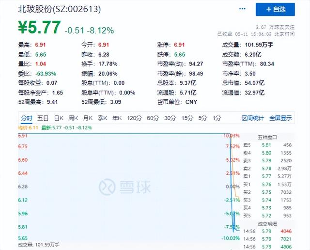 5月11日消息,北玻股份尾盘炸板触及跌停,一度上演“天地板”。不过截至收盘,股价打开跌停,最终跌8.12%,报5.77元/股,总市值54.07亿元。