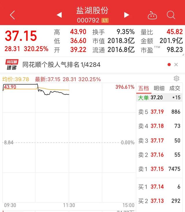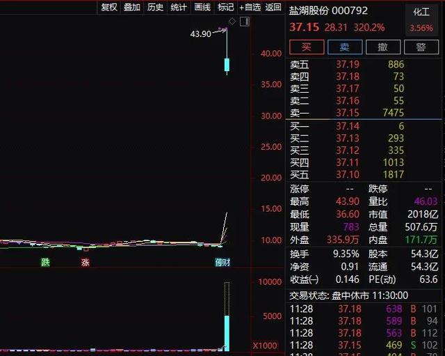 万众期盼,果不其然,盐湖股份恢复上市,上演暴涨神话,股吧里“嗨”声一片。盐湖股份以39.22元开盘,大涨343.67%,开盘就拉升10%,涨幅达到388.12%,触发10%“涨停”临时停牌“熔断”,停牌1小时后震荡,上午收盘大涨320.2%,报37.15元,市值2018亿元。