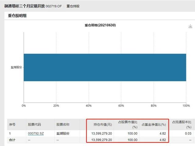 公开信息显示,就融通基金旗下1只债券基金持有盐湖股份,持股153.84万股,今天恢复上市前持股市值1360万元,持仓占净值比4.82%;今年二季度末该基金的资产净值为2.82亿元。