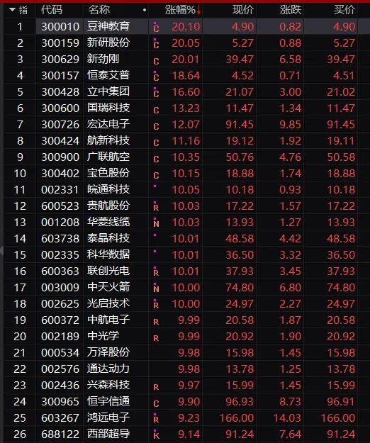多只军工股暴涨,新研股份、新劲刚20%涨停,航新科技、国瑞科技、宏达电子等大涨,光启技术、中航电子等也涨停。