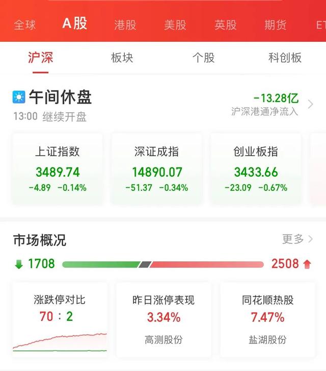 上午,上证指数跌0.14%,深证成指跌0.34%,创业板指数跌0.67%,科创50指数微涨0.07%,个股涨多跌少,2508只上涨,1708只下跌,两市成交额7823亿元。