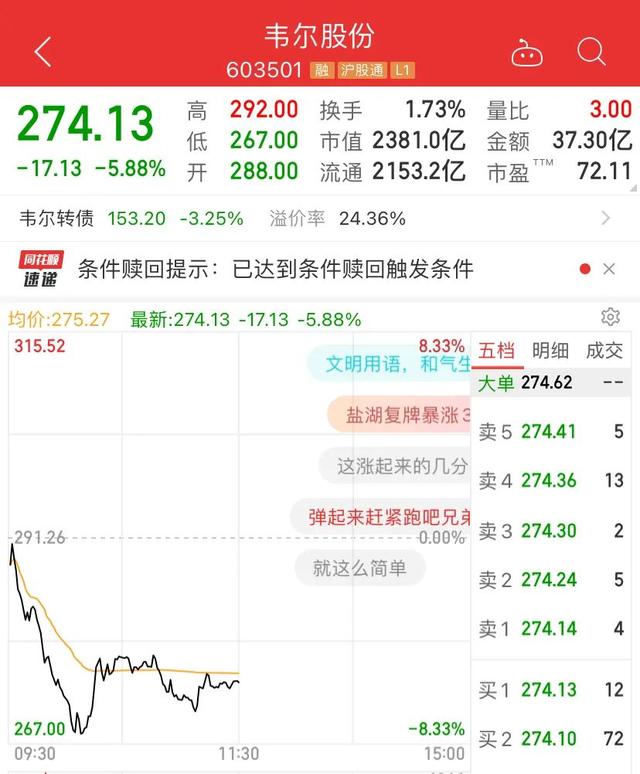 2000多亿的韦尔股份早盘突然闪崩,盘中一度跌8%,上午收盘大跌5.88%。