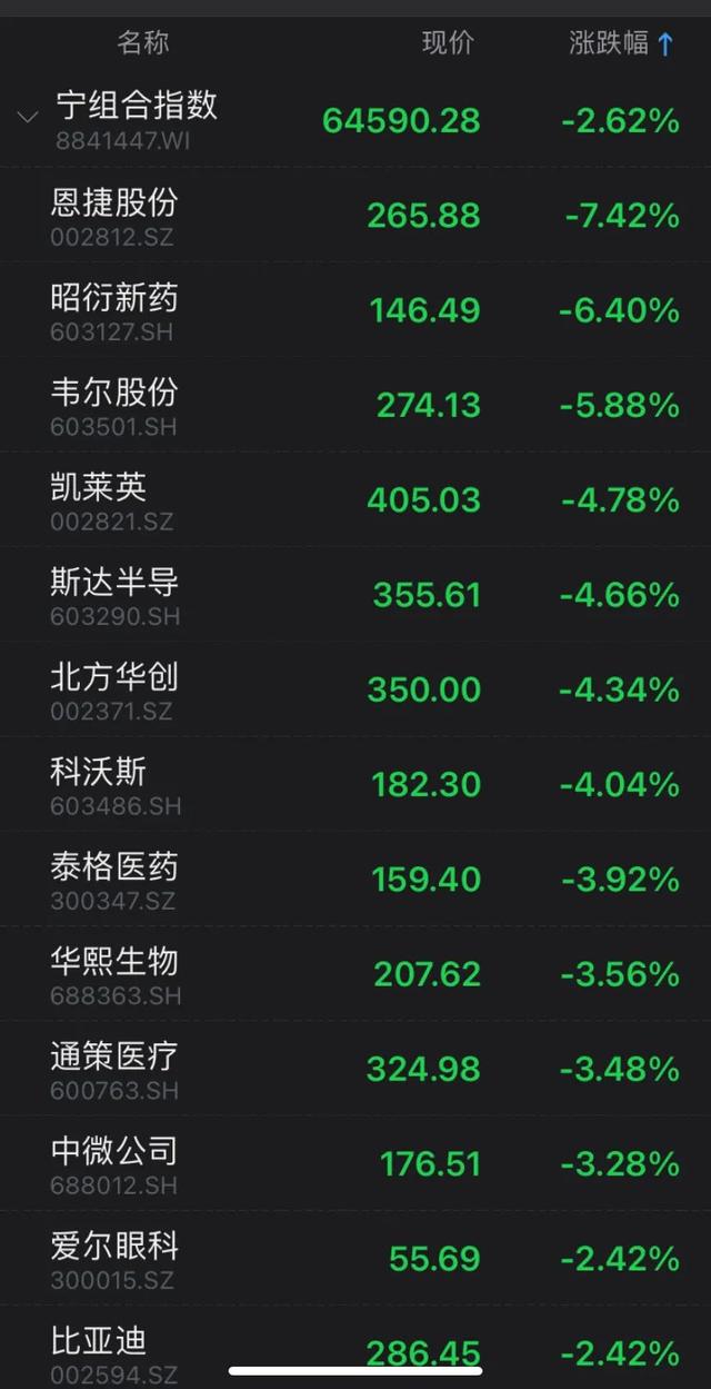 虽然指数和大盘窄幅震荡,之前的千亿大市值牛股,机构抱团的赛道,新起的宁组合却跌惨了,指数大跌2.62%。成分股恩捷股份大跌逾7%,昭衍新药跌超6%,韦尔股份、凯莱英、斯达半导等都跌幅较大。