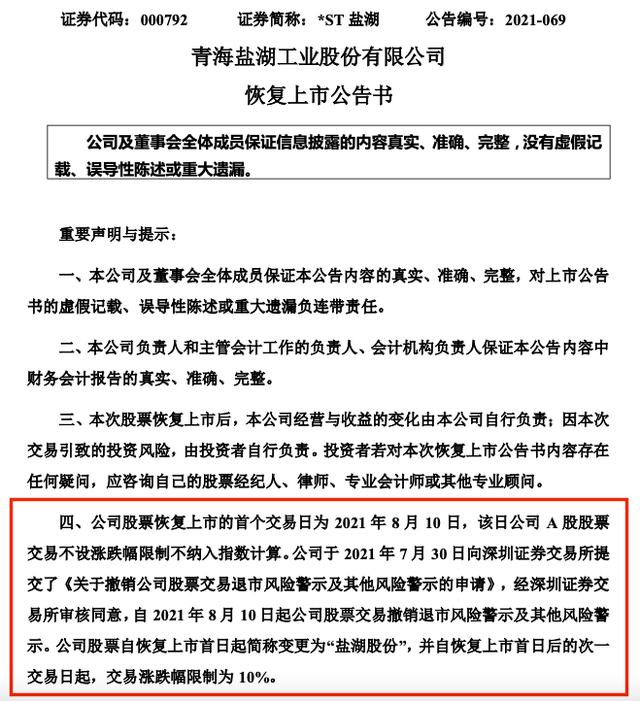 7月31日,暂停上市15个月后,*ST盐湖发布公告,让持有股票的57227户股东欢呼雀跃。公告称,*ST盐湖收到深交所通知,公司股票将于8月10日在深交所恢复交易,同时,公司向深交所提交了撤销公司股票交易退市风险警示及其他风险警示的书面申请,待交易所核准后,公司股票简称由*ST盐湖变更为盐湖股份