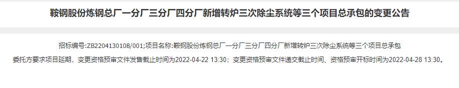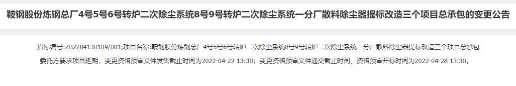 鞍钢电子招标投标交易平台发布鞍钢股份炼钢总厂一分厂三分厂四分厂新增转炉三次除尘系统等三个项目总承包变更公告;鞍钢股份炼钢总厂4号5号6号转炉二次除尘系统8号9号转炉二次除尘系统一分厂散料除尘器提标改造三个项目总承包变更公告。