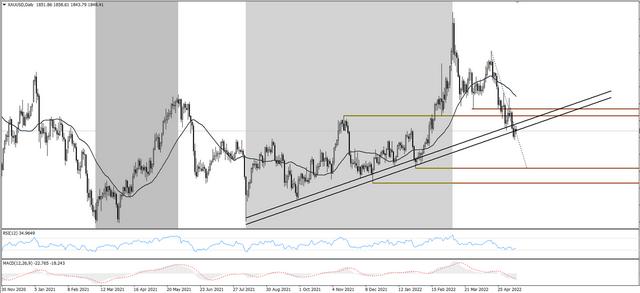 从技术指标来看: 金价跌破100天均线,而30天均线和50天均线已掉头向下;MACD柱处于零轴之下且逐渐偏离零轴;相对强弱指数(RSI)在超卖临界值上方波动。综合来说,黄金后市仍倾向于看空。
