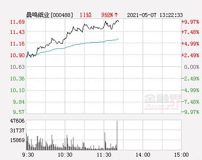金融界网5月7日消息,今日晨鸣纸业开盘报10.8元,截止13:20分,该股涨9.97%报11.69元,封上涨停板。