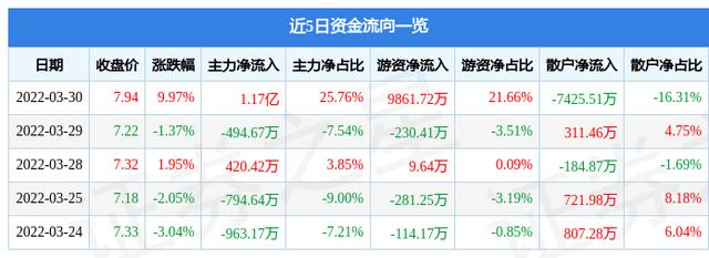 资金流向数据方面,当日主力资金净流入1.17亿元,游资资金净流入9861.72万元,散户资金净流出7425.51万元。近5日资金流向一览见下表: