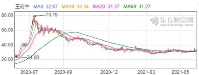 对比2020年同期王府井股价小幅下滑。 来源:东方财富网