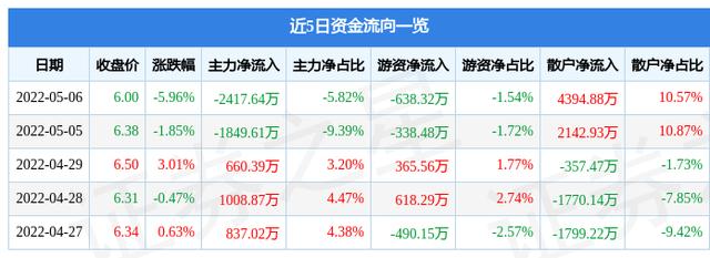 资金流向数据方面,5月6日主力资金净流出2417.64万元,游资资金净流出638.32万元,散户资金净流入4394.88万元。