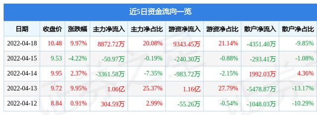 资金流向数据方面,当日主力资金净流入8872.72万元,游资资金净流入9343.45万元,散户资金净流出4351.4万元。近5日资金流向一览见下表: