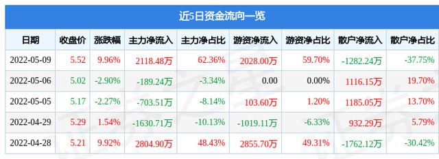 资金流向数据方面,5月9日主力资金净流入2118.48万元,游资资金净流入2028.0万元,散户资金净流出1282.24万元。