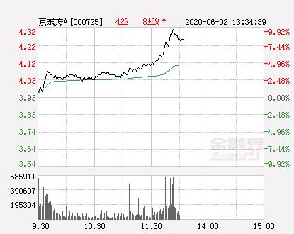 金融界网站6月2日讯 今日京东方A开盘报3.96元,截止13:30分,该股涨9.92%报4.32元,封上涨停板。