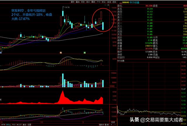 我们通过案例来说明问题,更有现实意义,比方说今天大跌-17.675的300045华力创通股票,我们来看一下它的走势图: