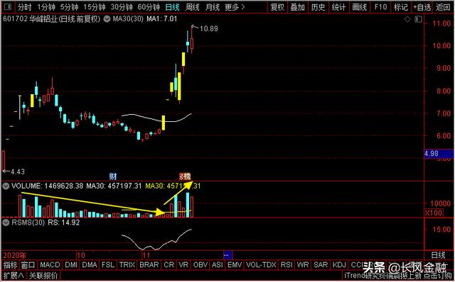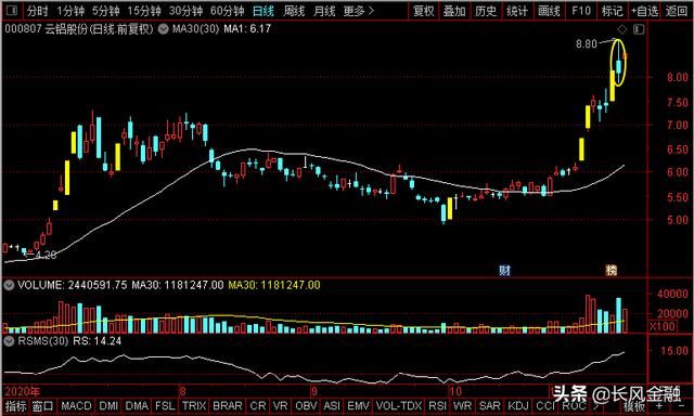 云铝连续两个涨停创新高,两个涨停之后是三个小实体整理,之后再拉涨停,不过,最近一根冲高回落的大阴线成交量有些大,说明资金在这个位置还是有一定分歧。