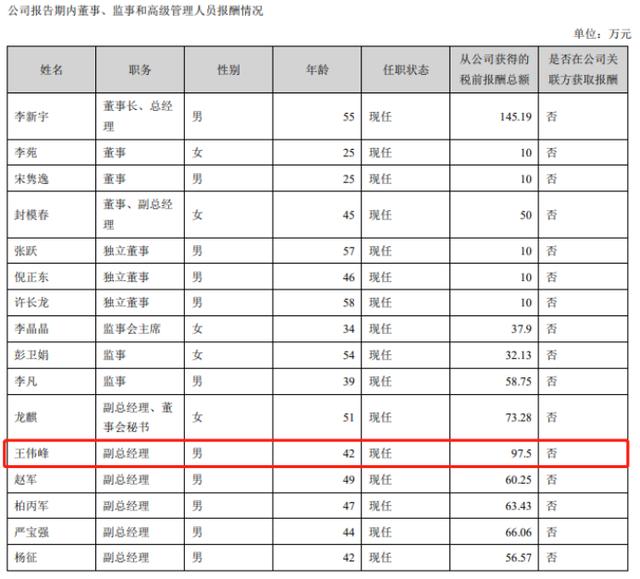 而作为资深的高管之一,王伟峰的薪酬也备受外界关注。根据拓维信息2020年年度报告显示,作为公司的副总经理,王伟峰从公司获得的税前报酬总额为97.5万元,在公司众多副总经理中他最高,而他的薪酬也仅次于董事长兼总经理的李新宇。