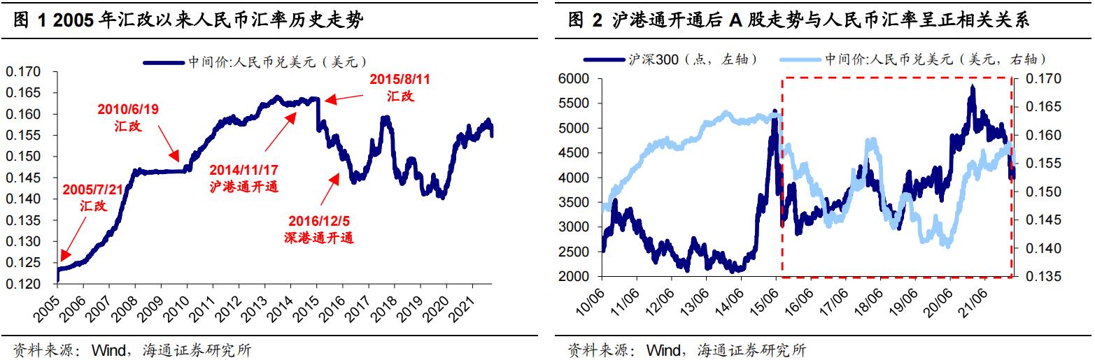 我国人民币汇率形成机制经历了多次改革,循序渐进地推动人民币汇率的市场化和国际化。2005年7月21日我国开始实行以市场供求为基础、参考一篮子货币进行调节、有管理的浮动汇率制度。2010年6月19日中国人民银行决定进一步推进人民币汇率形成机制改革,增强人民币汇率弹性。2015年8月11日央行宣布完善人民币对美元汇率中间价报价机制。此外,A股市场也经历了不断开放的过程,2014年11月17日沪港通正式开通,2016年12月5日深港通正式开通,进一步扩大了A股的对外开放。