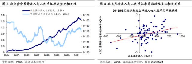 14年底以来A股与人民币升值转为正相关,但相关性仍弱。2010年6月19日汇率改革以来(截至2022/4/22,下同),万得全A指数与人民币升值的相关系数为-0.31,沪深300为-0.33,人民币升值与股市负相关。而2014年11月17日沪港通开通后,两者之间的关系转为正相关,万得全A指数与人民币升值的相关系数为0.35,沪深300为0.25。再分析指数月度涨幅与人民币月度升值幅度的相关系数,沪港通开通后万得全A指数、沪深300分别为0.31和0.37。