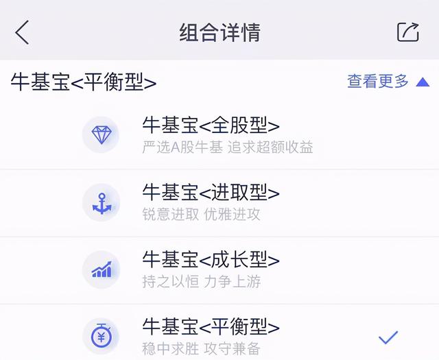 牛基宝有7个类型,风险逐级提高。从任何一个组合的页面里,看顶部“查看更多”,就可以看到所有类型的组合: