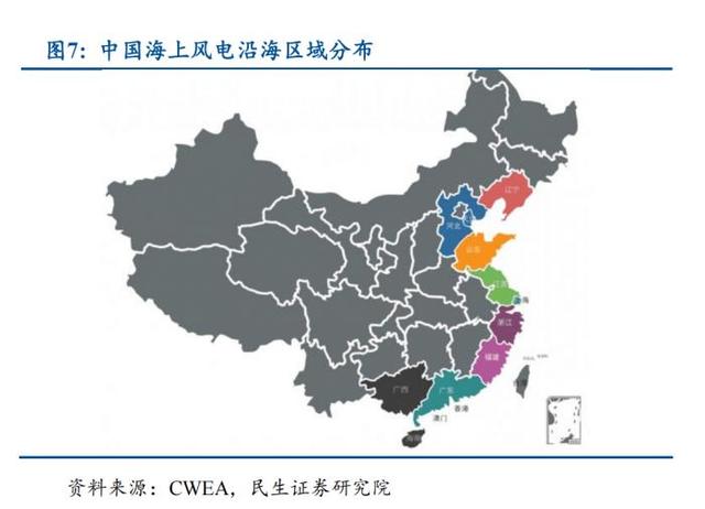 我国海上风电潜在可开发资源丰富。四大海上基地所在省份浙江、江苏、山东已规划公布的“十四五”期间新增风电装机分别为4.55GW、9.09GW、5GW,另外还有广东计划新增的17GW、广西的8GW等,预计“十四五”期间海上风电将贡献45GW以上新增装机。