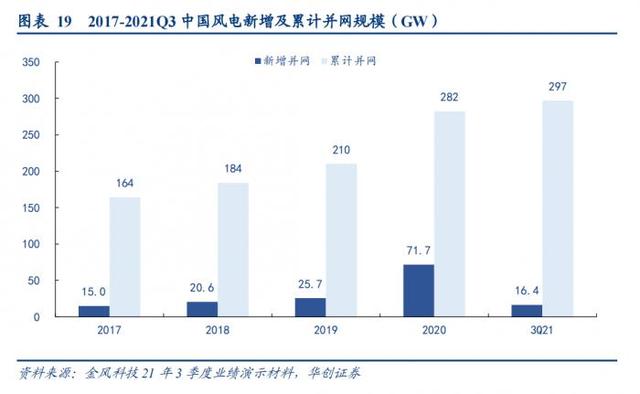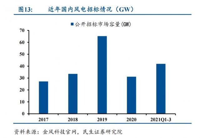 需求侧:2021 年初至今国内风机价格降幅和招标量超预期。2021年初至今风机大型化和轻量化进程加速,风机价格大幅下降,当前主流价格大致在2200-2400元/kW。风机的大型化又带来 了风场BOP成本的下降。在建设成本大幅下降、平价时代项目收益率不降反升的背景下,前三季度国内风电招标量突破40GW,同比增长115.1%。