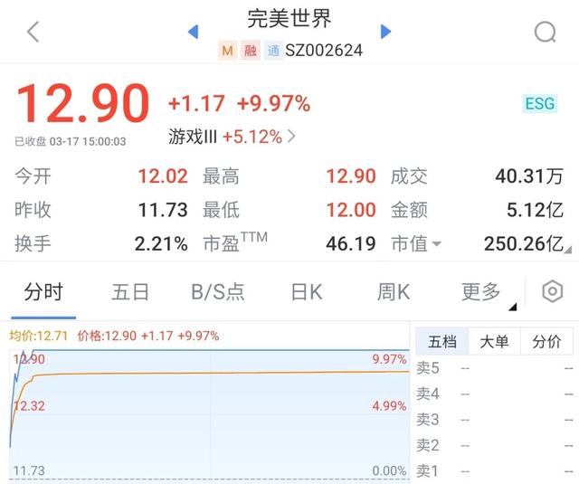 受《幻塔》出海、《梦幻新诛仙》台服上线和游戏板块整体走强等多重利好消息的影响,今日完美世界股票高开高走,早盘不到15分钟即涨停,最终全天股价维持封停,报收12.9元/股。
