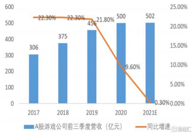 2021 前三季度 A 股游戏板块 18 家标的(剔除 ST)总营收达 502 亿元, 同比增长 0.3%,几乎停滞增长。
