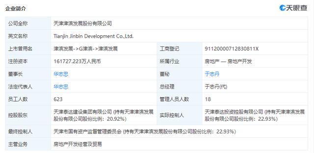 天眼查资料显示,津滨发展成立于1998年12月,是天津滨海新区首家以募集方式创立的股份公司,1999年4月22日在深圳证券交易所挂牌交易,注册资本16.17亿元,主营业务包括房地产开发经营及贸易。