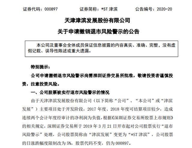津滨发展称,根据公司2019年度业绩情况,公司已符合申请撤销退市风险警示的条件,并于2020年3月11日向深圳证券交易所提交撤销退市风险警示的申请。