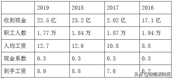 员工人数从16年至19年四年时间减少了1700人,平均每年减少425人,工资却从8.8万增加至12.7万,四年间平均增加了44%。