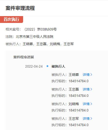 近日,中国执行信息公开网新增了一则被执行人信息,立案日期2022年4月24日,案号为“(2022)京03执609号”,被执行人包括华谊兄弟(天津)投资有限公司、王忠军、王忠磊、王晓蓉和刘晓梅,执行标的约1.85亿元。