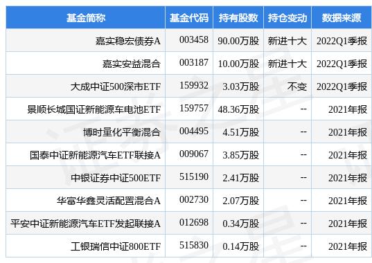 根据2022Q1季报基金重仓股数据,重仓该股的基金共3家,其中持有数量最多的基金为嘉实稳宏债券A。嘉实稳宏债券A目前规模为9.24亿元,最新净值1.5566(3月22日),较上一日下跌0.33%,近一年上涨14.92%。该基金现任基金经理为赖礼辉。赖礼辉在任的公募基金包括:嘉实安益混合,管理时间为2020年10月19日至今,期间收益率为8.21%;嘉实致安3个月定期债券,管理时间为2020年10月19日至今,期间收益率为6.85%;嘉实策略优选混合,管理时间为2020年12月4日至今,期间收益率为6.86%;