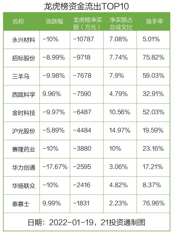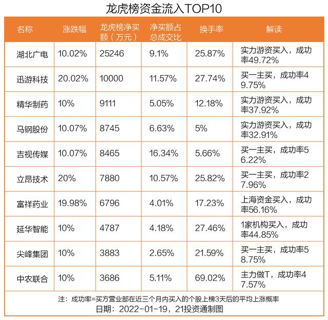 本文摘要:1月19日,上证指数下跌0.33%,深证成指下跌1.28%,创业板指下跌2.17%。盘后龙虎榜数据显示,共有48只个股因当日异动登上龙虎榜,资金净流入最多的是湖北广电(000665.SZ),达2.52亿元。据21投资通(微信号ID:touz… …
