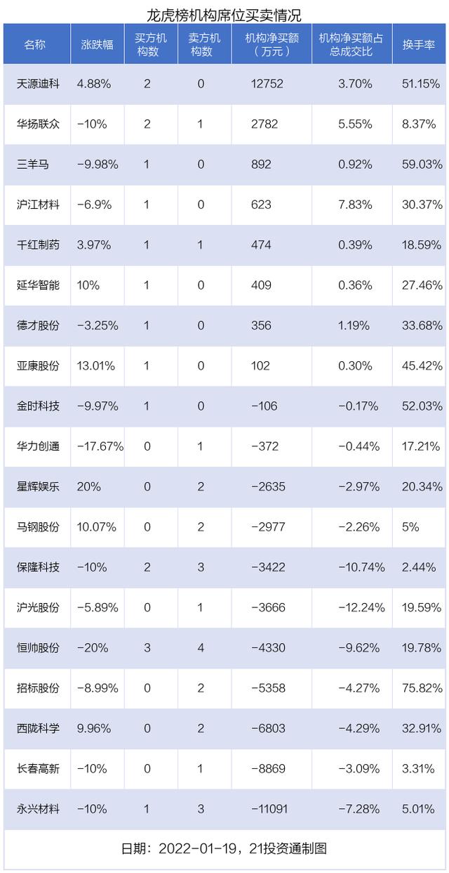 1月19日,19只个股龙虎榜出现了机构的身影,机构合计净卖出3.12亿元。具体来看,机构净买入8股,净卖出11股。