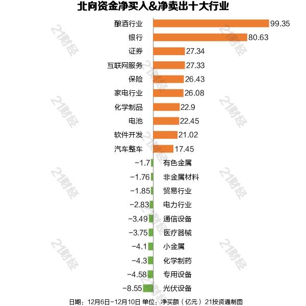 过去一周,从净买入金额来看,北向资金增持了71个行业,主要布局大消费、大金融板块,最青睐酿酒行业,净买入金额达99.35亿元;减持了29个行业,其中光伏设备最多,净卖出金额达8.55亿元,其次是专用设备行业,净卖出4.58亿元。