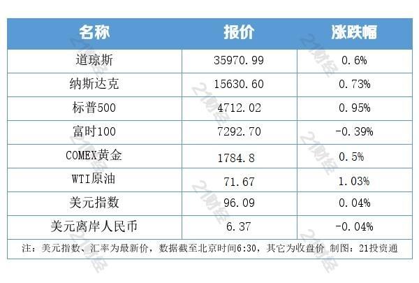 上周五,道指涨幅0.6%,报35970.99点,周涨4.02%;标普500指数涨幅0.95%,报4712.02点,周涨3.82%;纳指涨幅0.73%,报15630.60点,周涨3.61%。热门中概股涨跌互现。