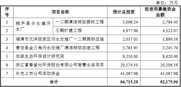 本次交易拟募集配套资金不超过82,175.96万元,募集资金在扣除中介机构费用及相关税费后,拟用于投入桐庐县分水镇污水厂一二期清洁排放提标工程项目、桐庐县分水镇污水厂三期扩建工程项目、福清市元洪投资区污水处理厂一二期提标改造项目、青田县金三角污水处理厂清洁排放改造工程项目、低碳生态环保设计研究院、浙江富春紫光环保股份有限公司智慧水务项目及补充上市公司流动资金。